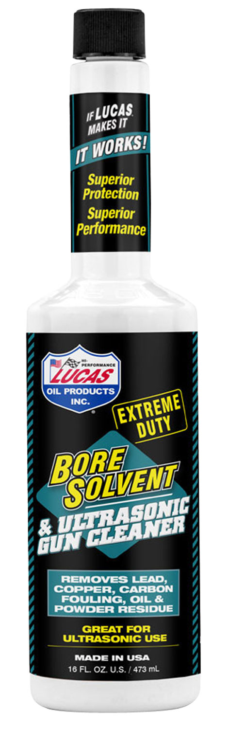 Used and recommended by major firearms manufacturers, Lucas Extreme Duty Bore Solvent & Ultrasonic Gun Cleaner is a premium blend of cleaning solvents and corrosion inhibitors. It easily removes carbon and powder residue from actions as well as copper and lead fouling from cylinders and barrels. The solvent based formula cleans deep to remove old oils and grease and provides a micro thin layer of rust and corrosion inhibitor on metal surfaces and bores. It is safe on polymers and factory applied firearm finishes.