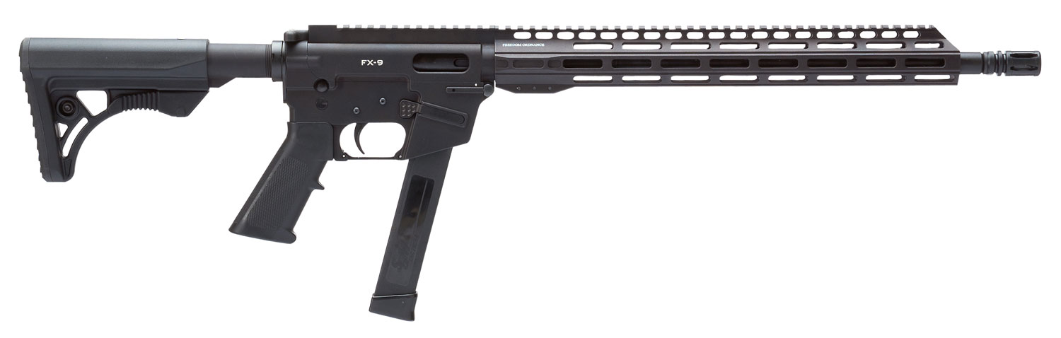 Freedom Ordnance FX9, Semi-automatic, AR, 9MM, 16" Barrel, Aluminum Frame, Matte Finish, Black, Plastic Grip, Manual Safety, Adjustable Stock, M-LOK Free Float Handguard, Uses Glock Style Magazines, 32 Rounds, 1 Magazine FX9R16| Action | Semi-Auto |