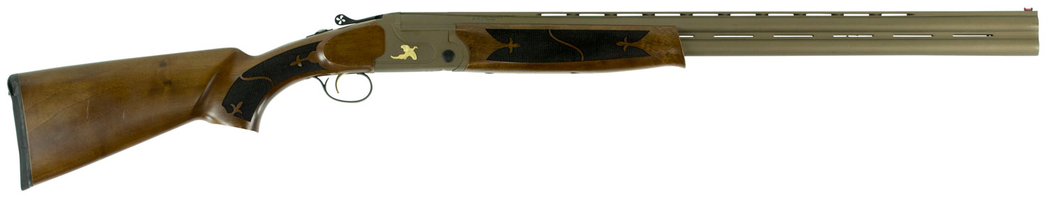 This firearm features a burnt bronze receiver finish, a walnut stock, and a tang safety with a barrel selector.| Action | Over/Under |