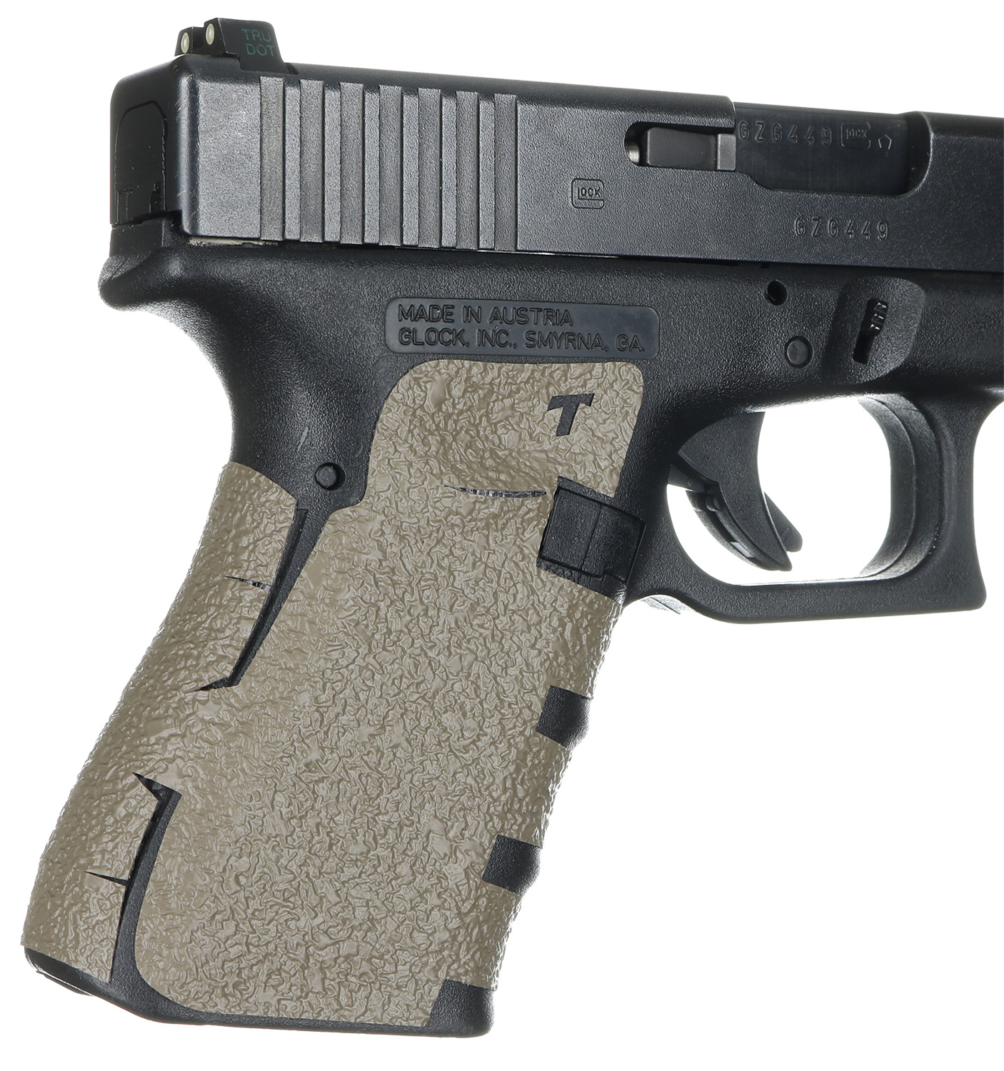 The Talon low profile grip is custom designed and manufactured for specific firearms. This rear wrap grip is constructed of a textured rubber, and offers full side panel coverage including the thumb rest, trigger guard, and high coverage on the backstrap. Compatible with Glock 19/23/25/32/38 Gen1-3 pistols and has a graphic cutout for the Glock emblem and a Moss finish. It also sticks well with the Rough Textured Frame (RTF) and three finger wraps for the finger groves under the trigger guard. Includes a cleaning pad.