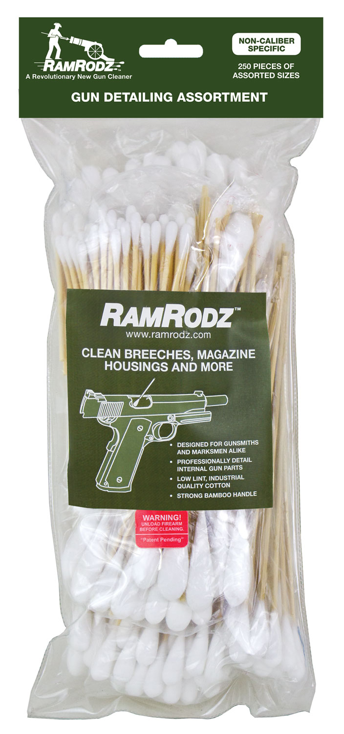 RamRodz Gun Detailing Assortment provides shooters with a large combo-pack of industrial-grade, low-lint cotton swabs with flexible bamboo handles. It can be used to clean all components of a firearm other than the bore. The variety of sizes included makes cleaning firearm components easier. From slide rails to bolt carriers, RamRodz provides a convenient and effective option for removing fouling, dirt, grease and debris from your firearm collection. This pack includes 100- .38/9mm, 25- .40 Caliber, 25- .45 Caliber and 100- Breech Cleaners. *Not for barrels.