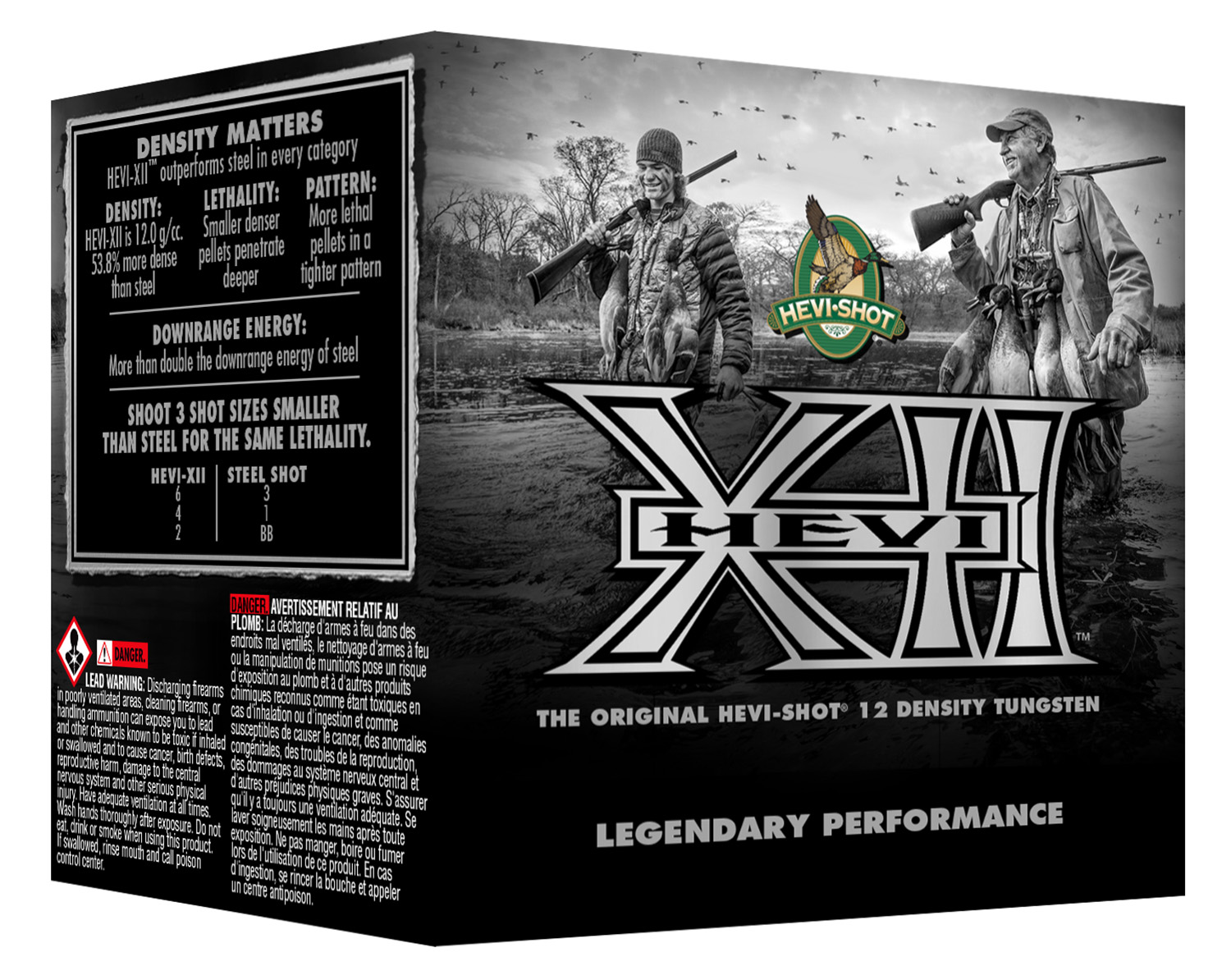 HEVI-XII is 53.8% more dense than steel, which translates to double the downrange energy. This allows you to drop down 3 shot sizes for the same lethality. It also gives you 28% more devastating pellets on target. More kills. Fewer Cripples. Better Stories. Pack in with HEVI-XII and walk out carrying extra weight.
