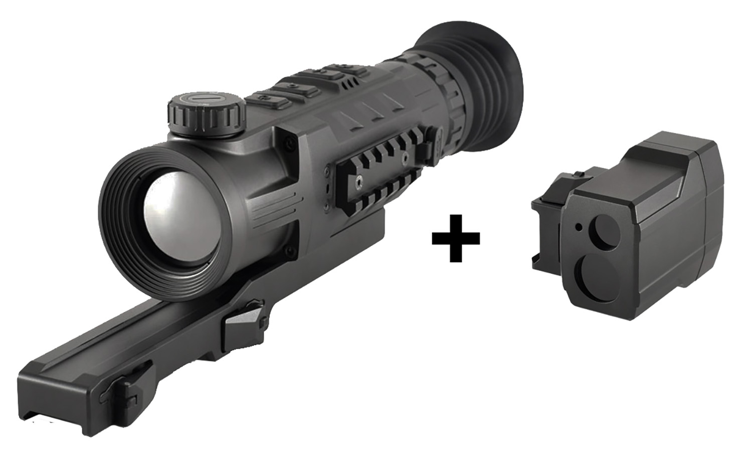 InfiRay Outdoor RICO MK1 & ILR 1000 Laser Rangefinder Combo-*Info shown is for MK1 640 SS#146628, see SS#140187 for info on the Laser Rangefinder. The iRay Micro II core and high contrast AMOLED HD display takes its image processing one step further with Advanced Image Correction and Automatic Image Optimization courtesy of the MATRIX III image algorithm. Unmatched image quality paired with an intuitive and easy to use interface, picture-in-picture picture function, 6 hr run time, Aluminum alloy housing, 1000 G shock resistance and 32 Gb of internal memory gives you all the tools you need to take your hunt to the next level. A Li-ion 3.7 V, 4400 mAh battery pack operates the Mk1 for a minimum of 6 hours and up to 10 hours on standby. The battery can be quickly removed and replaced with a new with external power connected to the USB-C connector if you don't want to power off. The InfiRay Outdoor ILR-1000 Infrared Laser Rangefinder Module integrates seamlessly with all RICO Mk1 Series thermal rifle scopes, taking the guesswork out of range estimation, day or night. The ILR-1000 provides +/- 1-yard range-to-target accuracy out to 1000 yards and overlays these results on the display of a connected Mk1 Series rifle scope. A ultra-lightweight aluminum chassis secured by an intuitive QD mount ensures dead-nuts repeatability and ease of use, even while wearing gloves.
