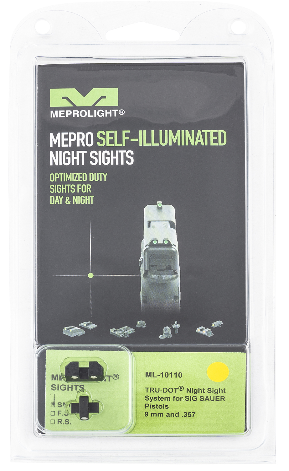 MEPROLIGHT combat-proven self-illuminated night sights enable you to upgrade your capabilities to hit stationary or moving targets under low-light conditions with dramatically increased hit probability. TRU-DOT models offer a handgun sighting system for improved rapid instinctive aiming which requires no transition from day to night use. Day and night, the shooters aiming reference is three solid dots, identical in appearance and location under all light conditions. Designed as replacement parts for the standard weapon sights, Meprolights Self-Illuminated night sights can be mounted directly with minor modifications. Meprolight is responding to users needs, our TRU-DOT models are available in various tritium dots color on the rear sight : Green, Yellow, Orange (Yellow or Orange for selected models only) and green tritium dot on the front sight. Fits Sig Sauer P-Series 9 mm/ .357 SIG Dovetailed #8 Front Sight/ #8 Rear Sight. Does not fit P365X/365XL. Front Sight Length: 0.43". Front Sight Width: 0.14". Front Sight Height: 0.22". Rear Sight Length: 0.34". Rear Sight Width: 0.63". Rear Sight Height: 0.25".