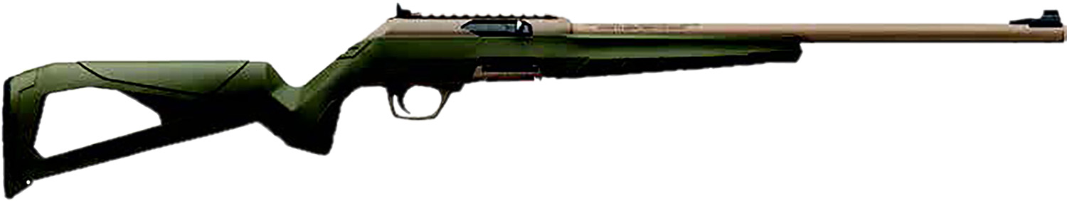 Get advanced autoloading rimfire rifle performance with Wildcat OD Green FDE. This Winchester 22 LR features a lightweight composite stock molded in OD Green. 10-round rotary magazine features last round bolt hold open. Flat Dark Earth Perma-Cote finish on the barrel and receiver. - Wildcat 22 LR FDE Features - Molded OD Green polymer stock - FDE (Flat Dark Earth) Perma-Cote finish on the barrel - FDE polymer receiver and trigger guard - Front and rear sling eyelets - Picatinny rail on underside of forearm includes rail cover - Wildcat Features - Reliable blowback semi-automatic operation - Drop-out lower receiver assembly for easy cleaning - Rugged polymer receiver with integral Picatinny top rail - Precision button-rifled barrel with recessed target crown - Striker-fired design with hemispherical firing pin tip - Fully-Adjustable Ghost Ring rear sight and ramped post front sight - Integral Picatinny Sight Rail - 10-Round Rotary Magazine with Polymer Body and Metal Feed Lips - Fully Ambidextrous Magazine Release - Spring Assisted Magazine Ejection - Reversible Manual Safety Button - Accepts aftermarket 10/22 magazines