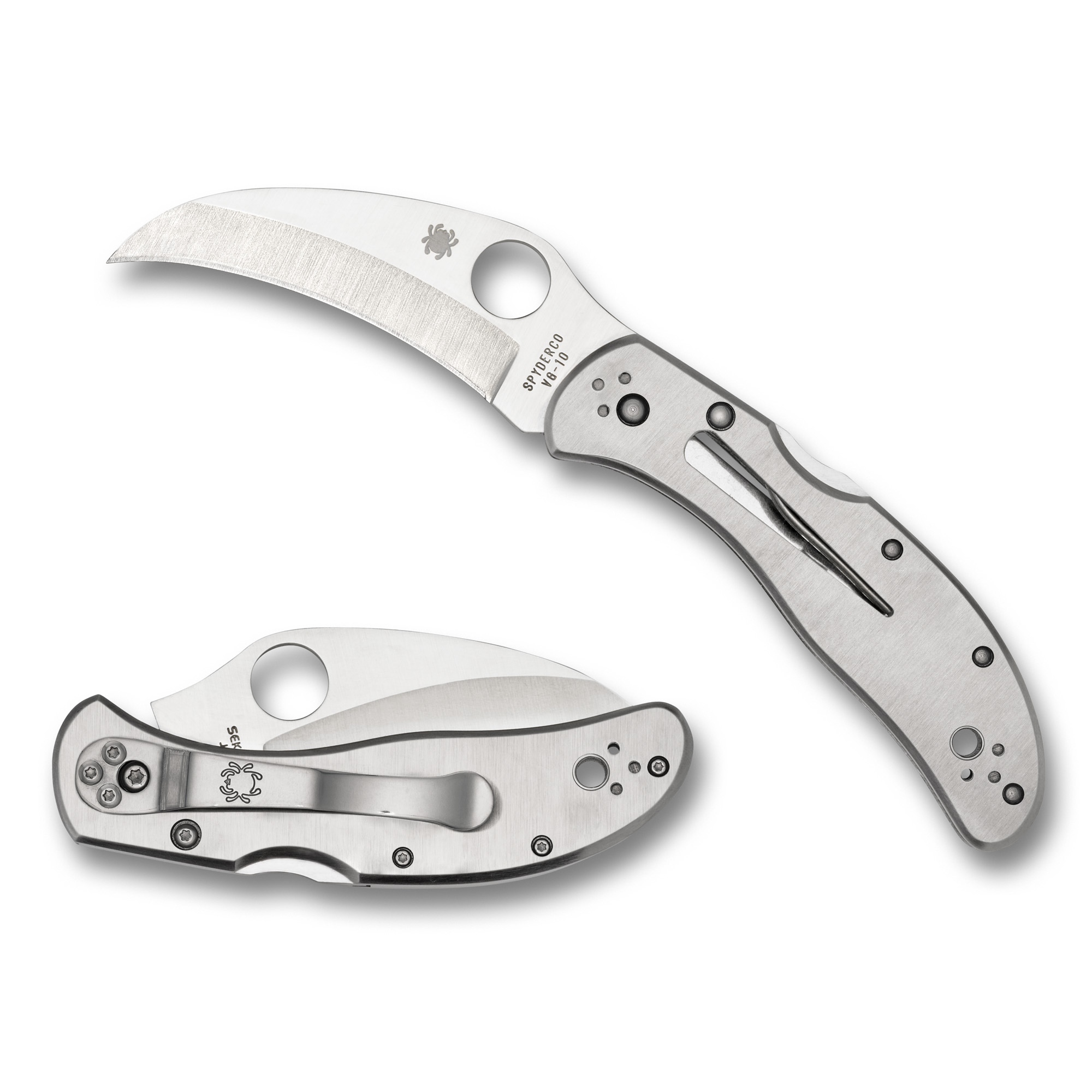 Spyderco Harpy Clipit, Folding Knife, 2.75" Hawkbill Blade, 6.63" Overall Length, VG-10 Stainless Blade Steel, Plain Edge, Satin Finish, Silver, Silver Stainless Handle, Back Lock C08P